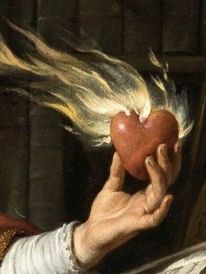 In the detail from Philippe de Champaigne’s painting of the saint, Augustine holds a flaming heart, symbol of his ardent desire to unlock the mysteries of knowledge and wisdom.