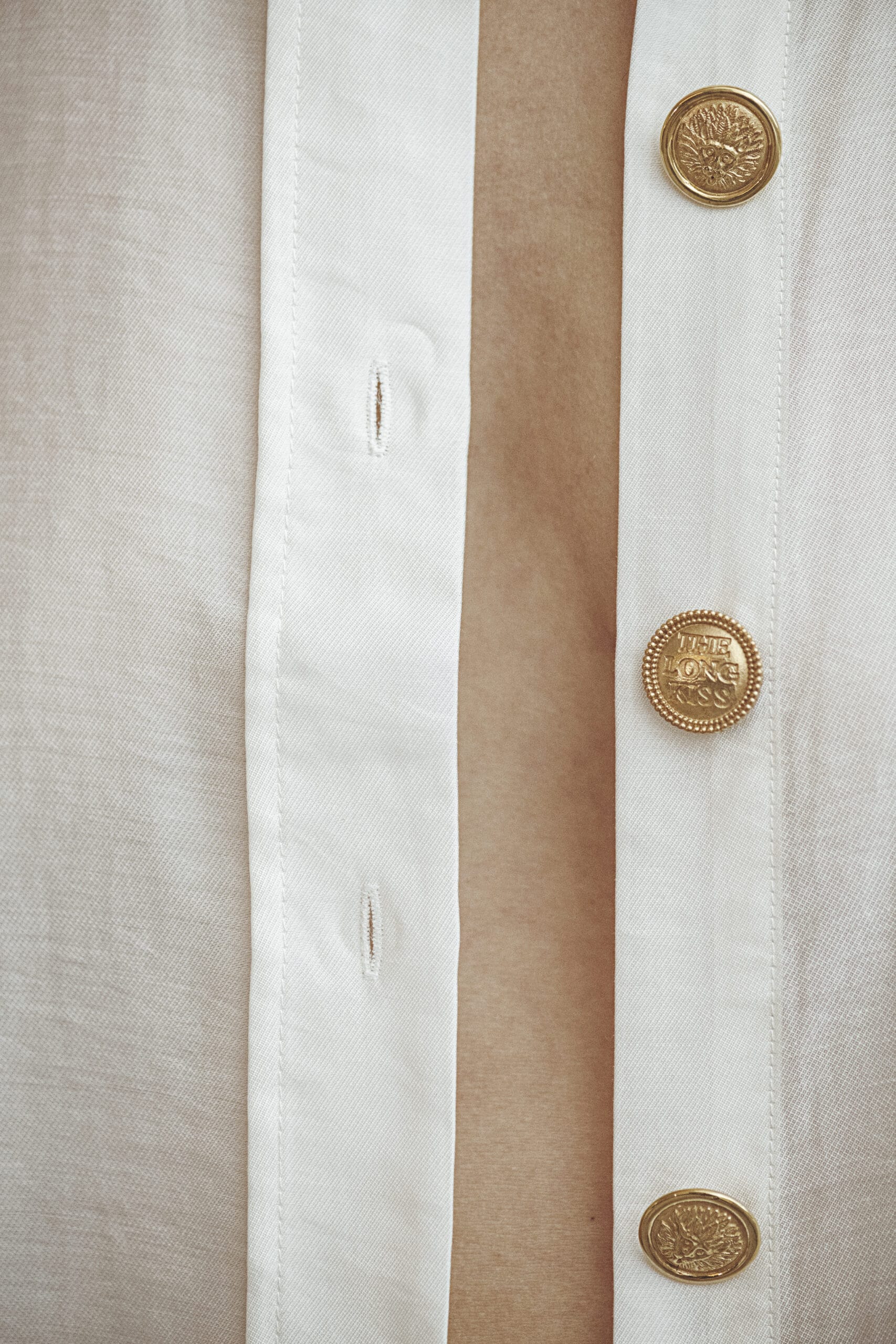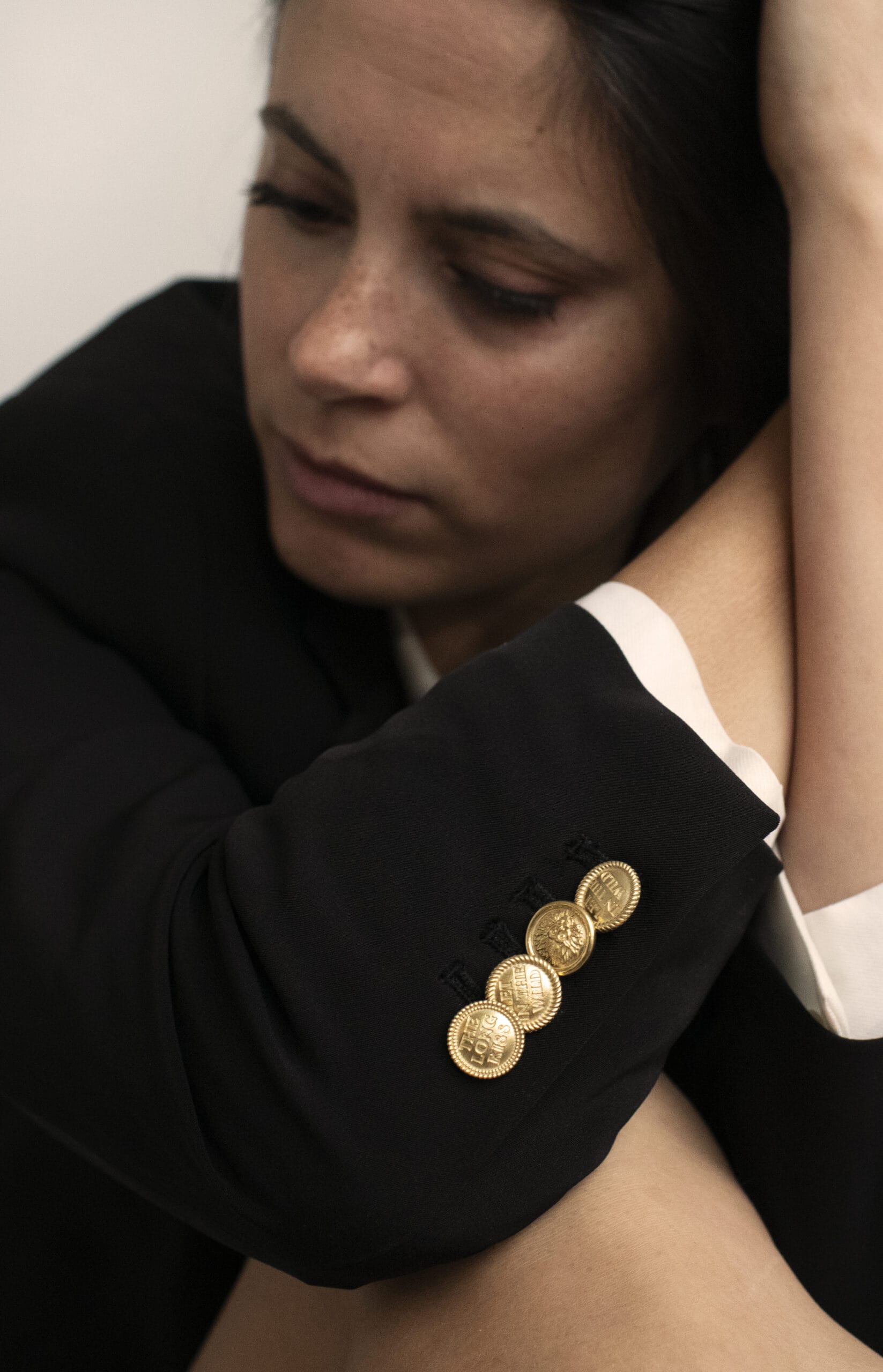 Gold shank button showing a creature´s head with it´s featherlike mane in relief and clean edge. Crafted from 18 karat gold and hand-finished by master goldsmiths. Diameter 20 mm. Part of the Kiss Collection.