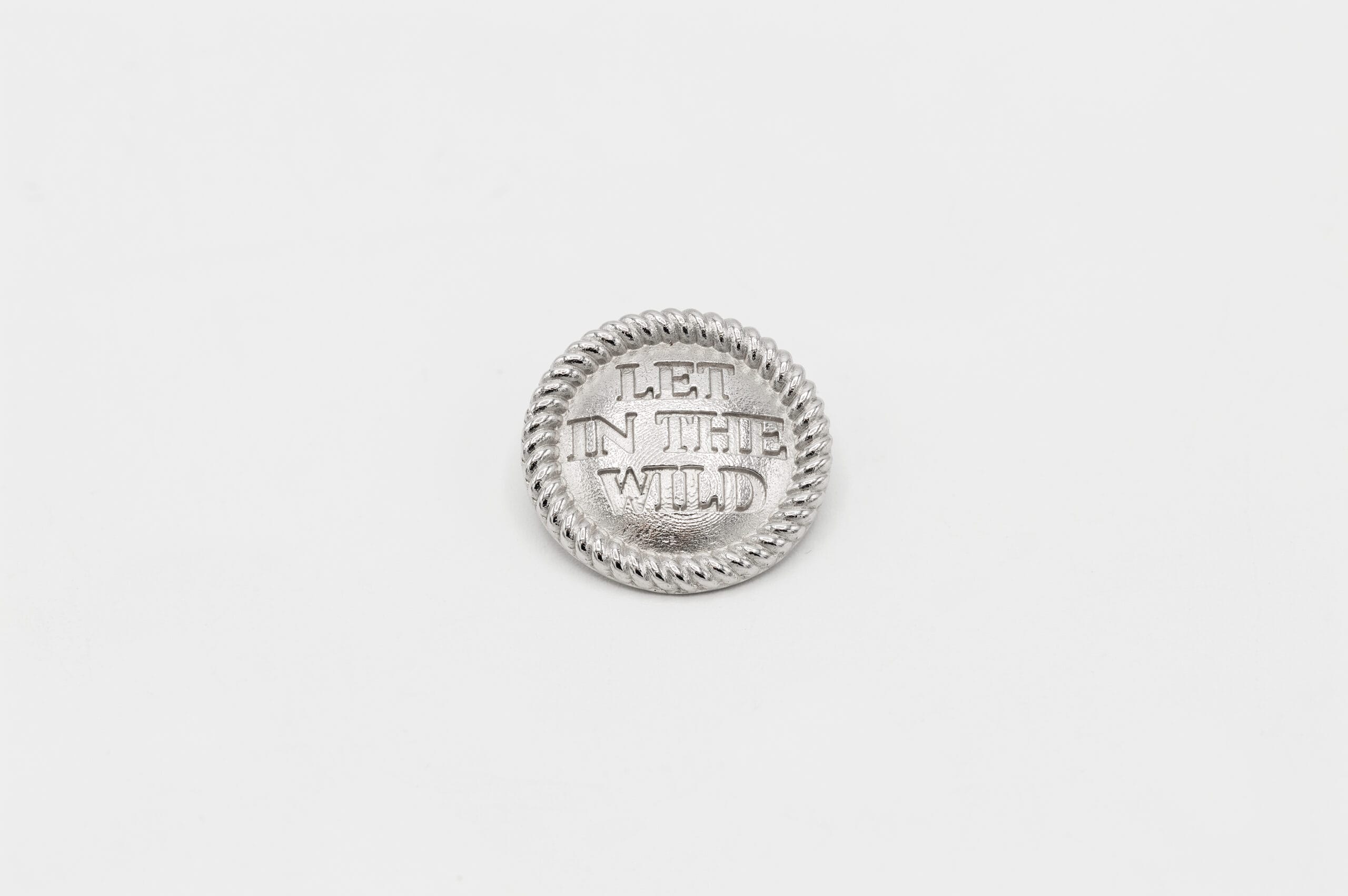Silver shank button with twisted rope edge and the inscription Let in the wild. Crafted from 925 Sterling silver, rhodium-plated and hand-finished by master goldsmiths. Diameter 20 mm. Part of the Kiss Collection.