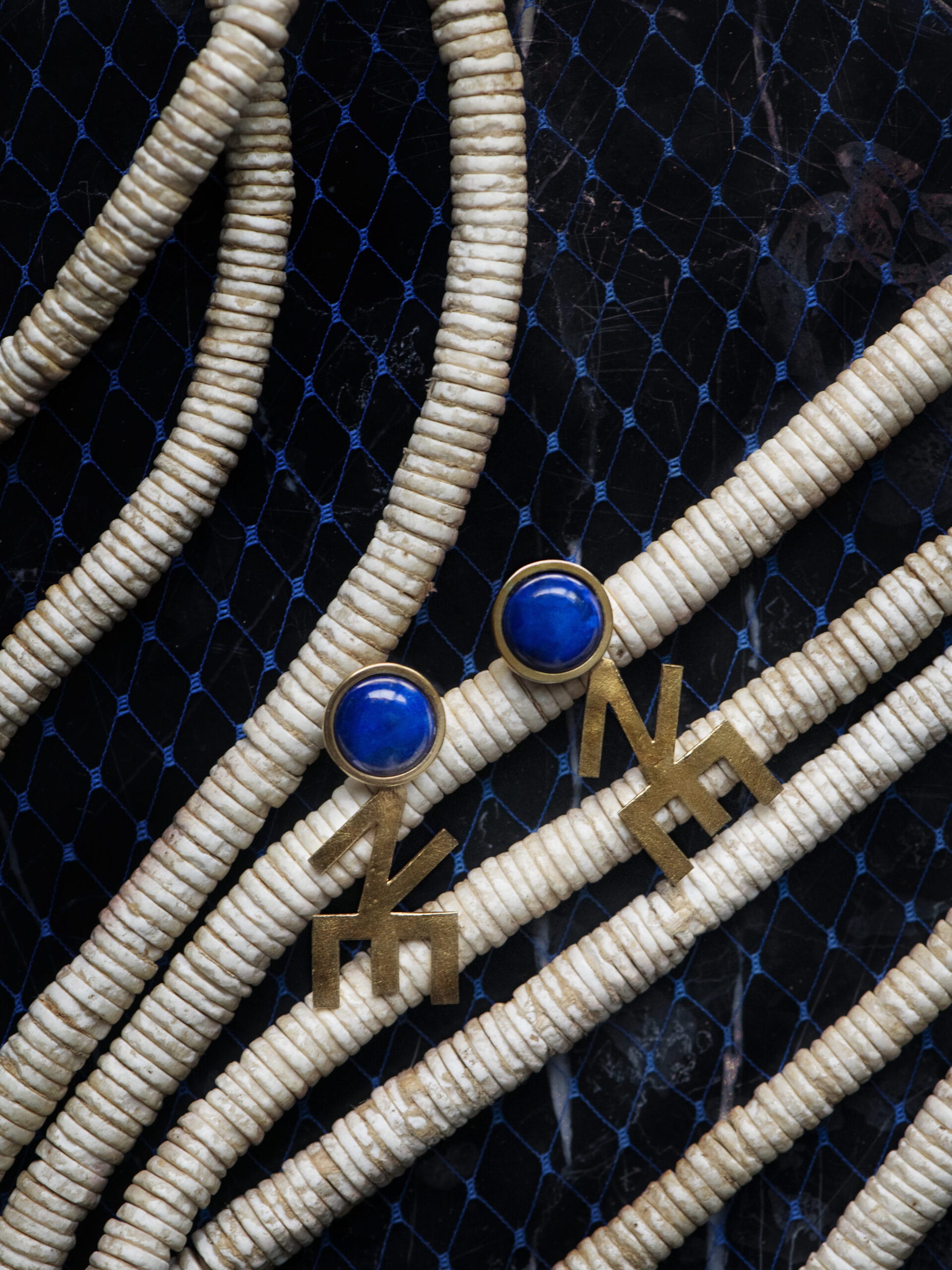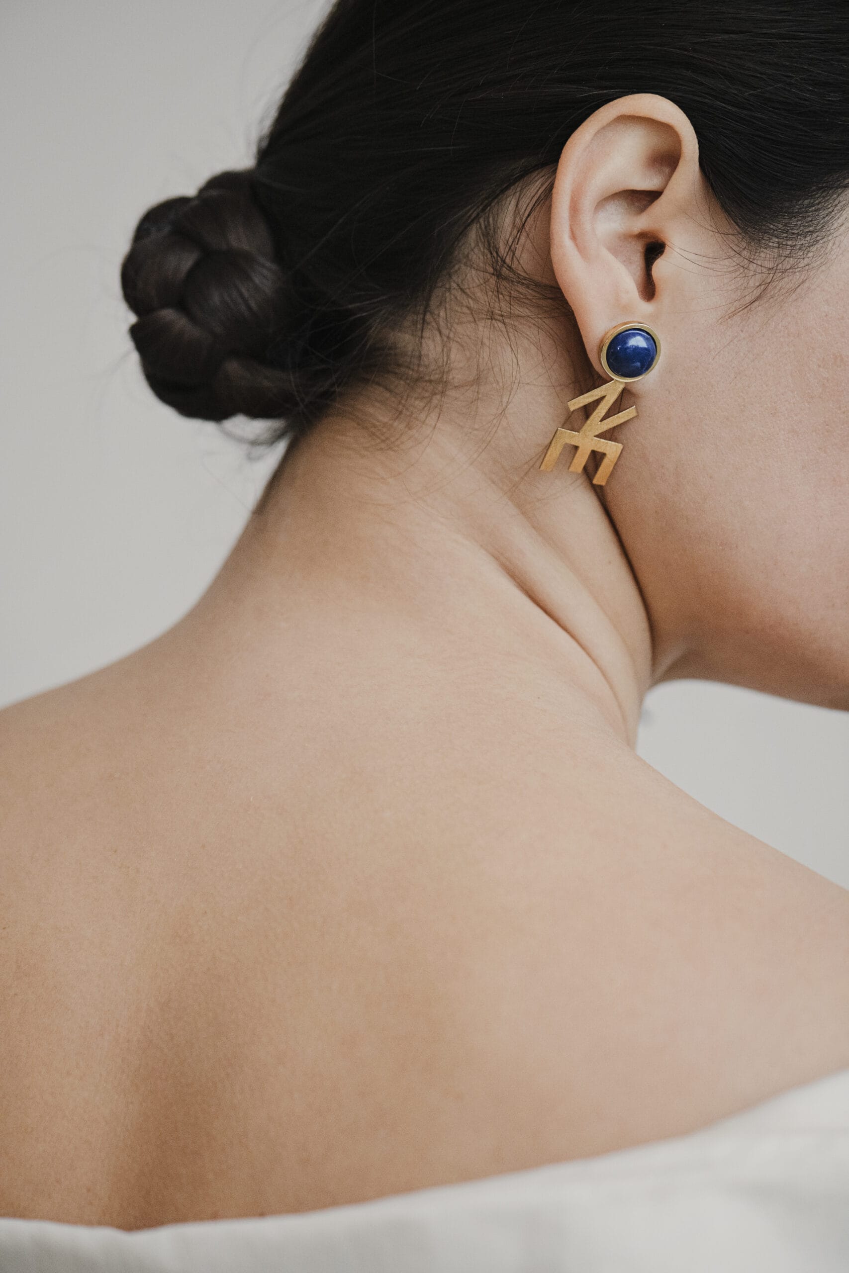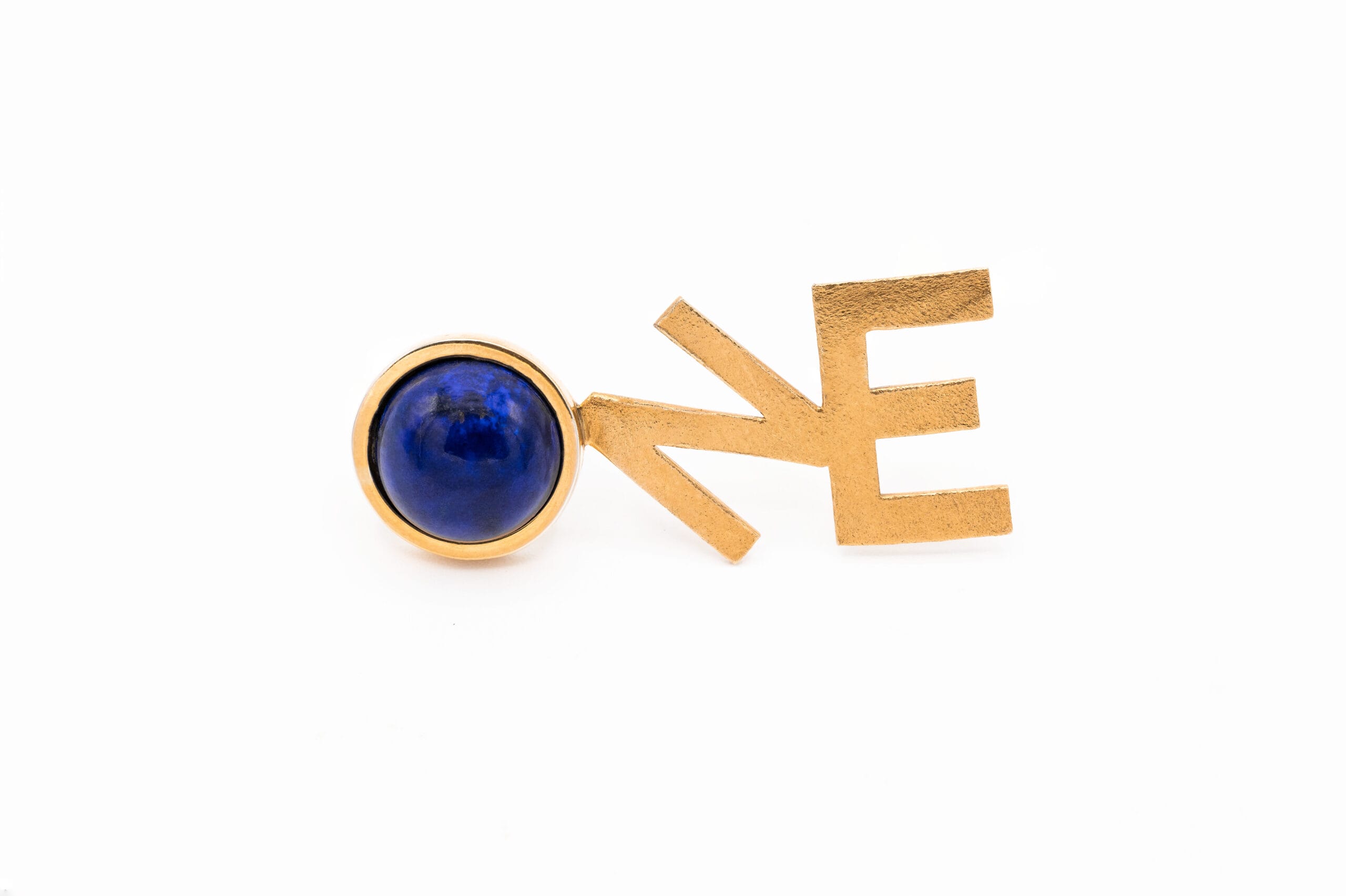 One shaped in gold with a deep blue Lapis Lazuli as planet earth. Crafted from 18 karat gold and hand-finished by master goldsmiths. Part of the One Collection.